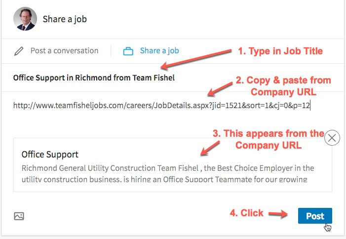 C. Enter in Job Title & Company URL into Jobs tab and Post